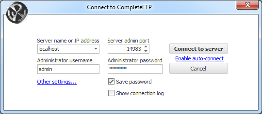 The connect dialog box is brought up when the manager is selected. This allows details of the host that the CompleteFTP service is running on, and the administrator credentials to be entered.