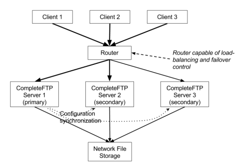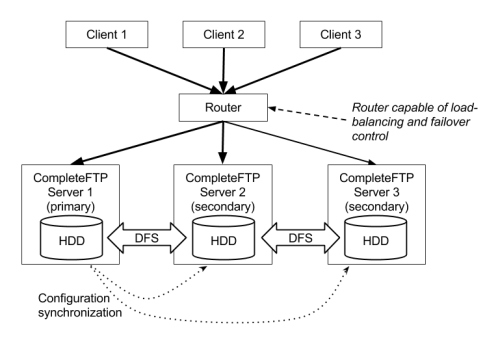 The diagram shows three clients connecting to a cluster via a router. This could be be done via any supported protocol, such as FTPS, SFTP or HTTPS. The router would be capable of load-balancing and/or failover control. It directs incoming requests to one of the three servers. The way in which it selects the server depends on how it's configured. The three servers are all running CompleteFTP and are configured to all be capable of responding to the same requests. One of the servers is set to be the primary from within CompleteFTP. All configuration changes must be made via this server. It is responsible for distributing configuration changes to the secondaries. This is done in near-real-time. While CompleteFTP takes responsibility for synchronizing configuration changes between the three servers, it does not synchronize the files on the Hard Disk-Drive (HDD) - this is left to Windows DFS. The Windows DFS (Distributed File-System) is a feature of Windows Server 2008/2012 that synchronizes files and directories between server instances in near-real-time.