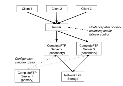 The main motivation for this is to reduce the load on the primary node. The primary node is more important than the secondaries since it's a central point for synchronization of configuration data for the following reasons: it's the node to which the administration console (CompleteFTP Manager) must connect in order to make configuration changes it is responsible for distributing those changes to the secondaries it is the node from which a secondary that is booting up will request a configuration update. While this architecture is preferable to the other architectures, it is by no means essential - it is only marginally better.