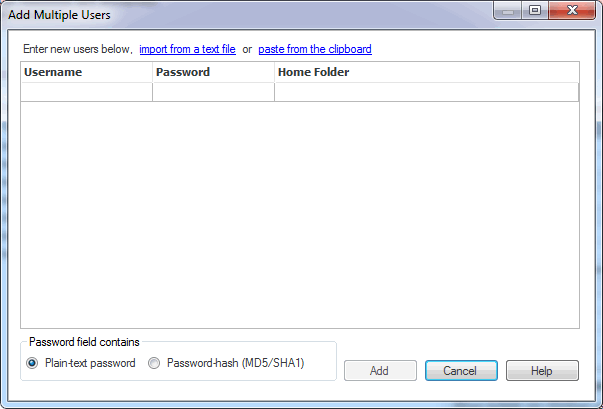 Users can be explicitly typed in, imported from a text file, or pasted from the clipboard. For the latter two cases, the text file or clipboard data needs to have a user per line, and fields must be separated by commas or tabs. The first field contains the username, the second field the password, and the third field the Windows path of the home folder. Only the username is mandatory. If the password is supplied as an MD5 hash rather than plaintext, then the MD5 radio button should be selected.