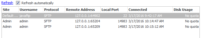 In the client connections tab the current connections to the server are shown. The Kill selected connection option can be used to immediately disconnect a user from the server. The admin user cannot be killed.