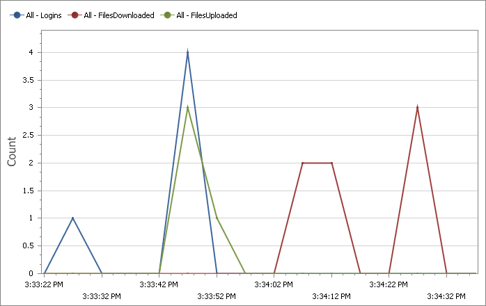 (Professional and Enterprise Editions only) A variety of real-time statistics can be charted, such as the number of connections, the number of file uploads and downloads, and the bytes uploaded and downloaded. These can be charted cumulatively and for each protocol.