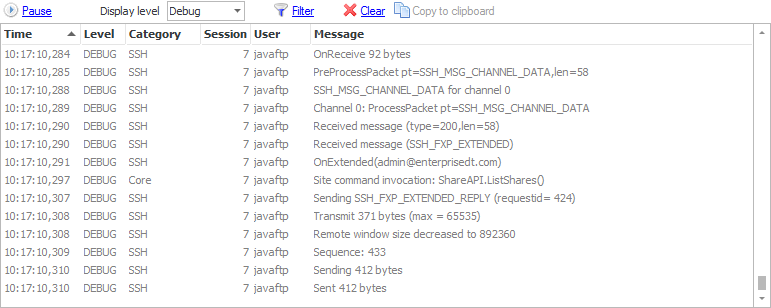 The Monitoring panel in the CompleteFTP manager displays real-time logging; details about the currently connected users; the IP addresses that have been auto-banned; server log files; and performance statistics (in Professional and Enterprise Editions only).