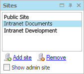 In the Enterprise Edition, the available sites are listed on the left hand side of the Sites panel. Sites can be added via the 'Add site' link, and deleted via the 'Remove' link. Extreme care should be taken when deleting sites.
